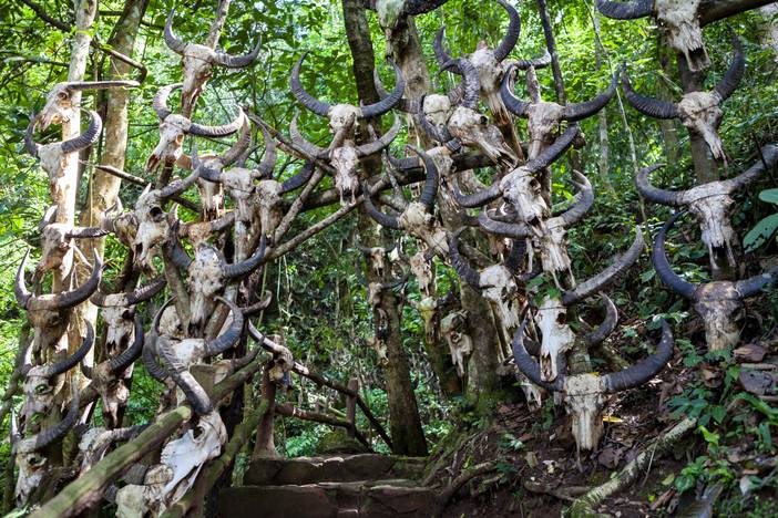 早餐后我们驱车前往佤族圣地西盟,【勐梭龙潭】是一个热带雨林淡水湖泊,这里林幽草密,常年云雾缭绕,幽深的谷底树梢和悬崖峭壁上悬挂着无数水牛头骨桩,到达后我们一起沿着美丽的勐梭龙潭走走,途中经过挂满牛头的【龙摩爷圣地】,世代居住在阿佤山上的佤族信奉万物有灵的自然崇拜,自古以牛为神圣吉祥物和崇拜图腾。走入龙摩爷,庄严肃穆、千姿百态,有着视觉冲击力和心灵震撼力的牛头,在这里感受原始崇拜的力量。