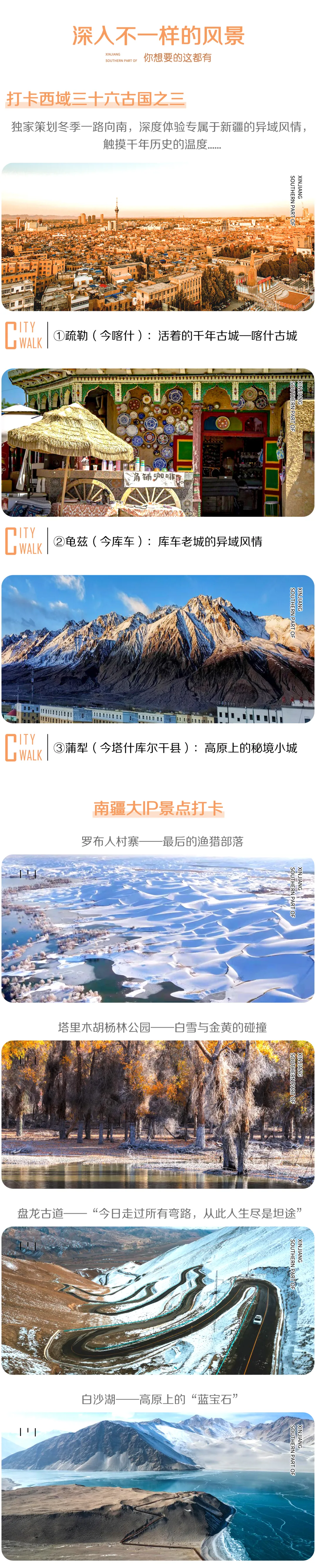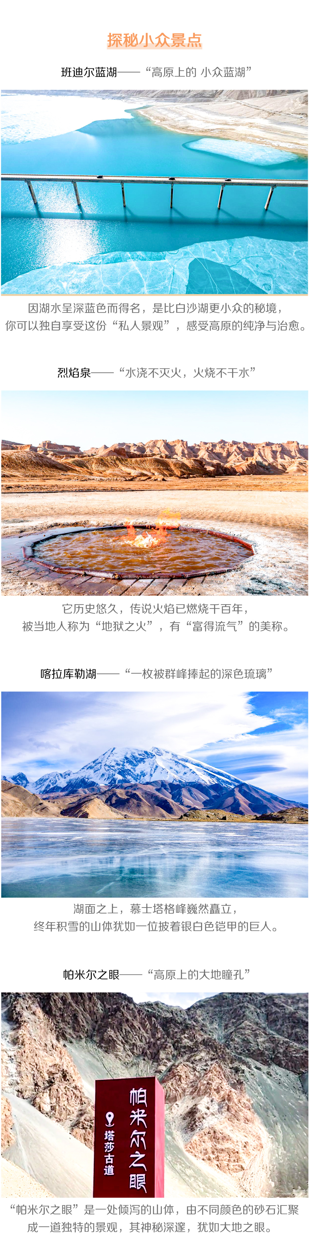 3. 门票:库车老城、喀什古城、盘龙古道、班迪尔蓝湖、帕米尔之眼、塔合曼湿地暂不收费,如遇政策性收费,门票需自理。