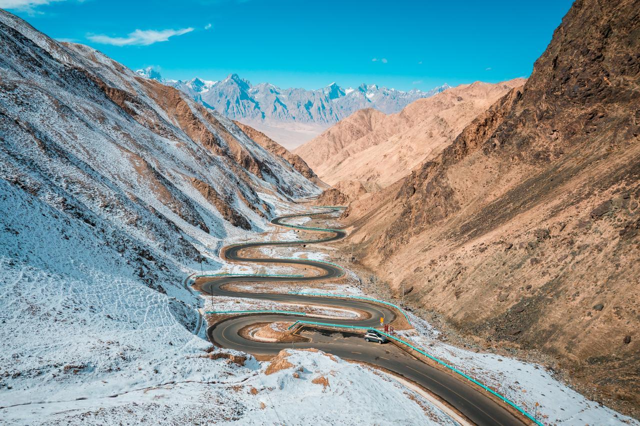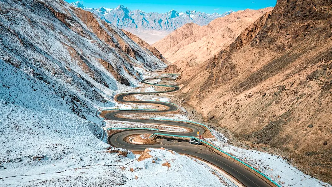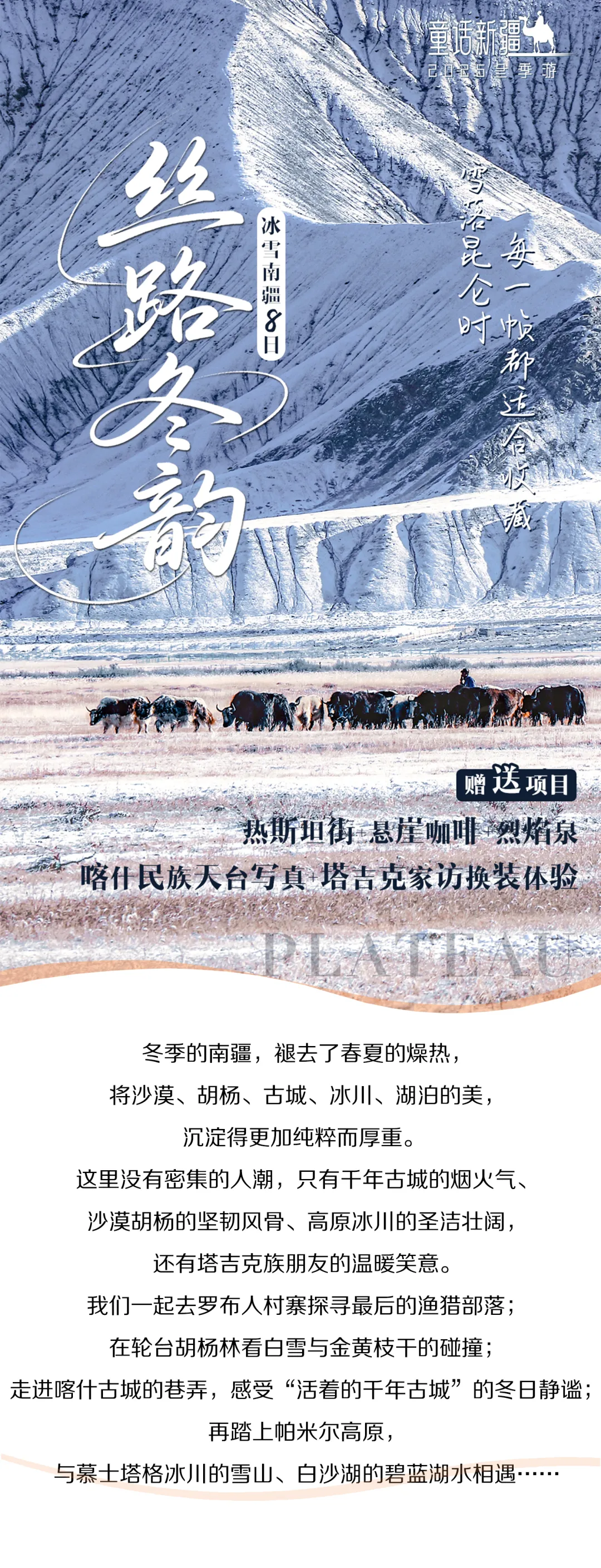 今日早起前往盘龙古道。这条高原公路以“600 多个弯道”“海拔落差 1000 多米”闻名,冬季部分路段覆盖薄雪,黑色公路在雪山与褐色山体间蜿蜒,宛如巨龙盘踞。看着“今日走过所有弯路,从此人生尽是坦途”的标语,成就感与震撼感十足,可在此拍照留念。随后经过班迪尔蓝湖,这是比白沙湖更小众的高原秘境,冬季湖面平静,深蓝色湖水与周围雪山、褐色山体形成强烈对比。接着前往帕米尔之眼,帕米尔之眼由不同颜色的砂石汇聚而成,正对道路的前方有一块突出山体形似人脸,仿佛正注视着过往车辆。其形成源于亿万年来的造山运动与冰川侵蚀,山体的褶皱与沟壑显得有些“狰狞”,充满力量感。后乘车返回喀什,途中观赏塔合曼湿地,冬季湿地覆盖薄雪,像一块巨大的白色绒毯,偶尔有牦牛、羊群走过,为这片静谧之地增添生机。抵达后办理酒店入住,晚上可自由前往喀什古城参观游览。
