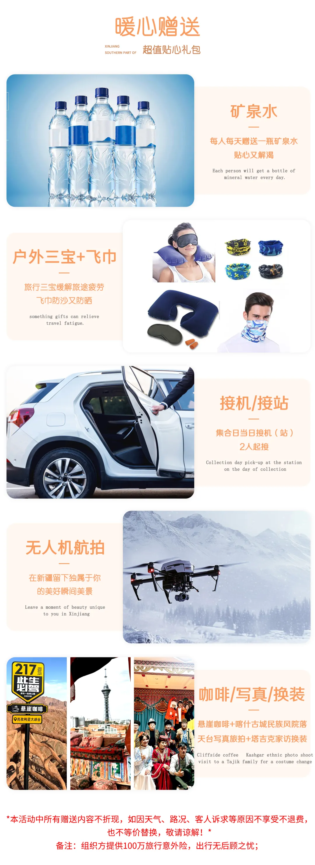 3.赠送集合日当天免费接机/接站服务(2人起赠送,提前抵达者请自行前往酒店)。请提前至少3天告知航班/车次信息,如未告知,视为自动放弃。默认安排拼车(1小时内),如您不想等待,可自行打车或搭乘地铁前往酒店(费用自理)。抵达乌鲁木齐机场/火车站后,请主动联系接机人员确认上车位置,如出现等候的情况,请给予谅解。不含送机及送站服务,送机(站)服务:5座车100元/辆、7座车200元/辆,如需要请提前至少1天告知工作人员。