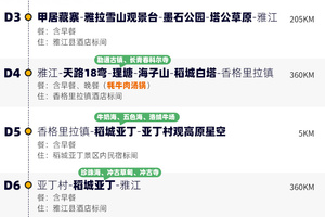 4、景交:四姑娘山观光车70元/人(必须),甲居藏寨观光车35元/人(必须),墨石公园观光车20元/人(必须),稻城亚丁观光车120元/人(必须)、稻城亚丁游览车70元/往返(可选);