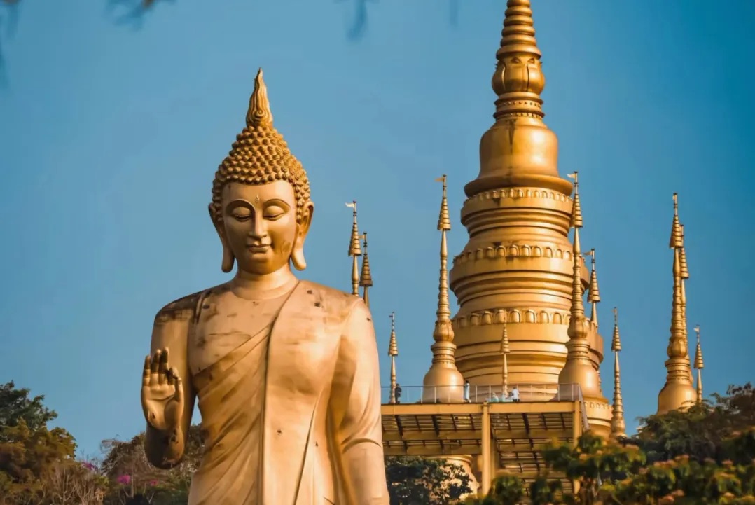 2、般若寺:西双版纳最纯洁神圣的寺庙,坐落在山上,寺庙不大但却小而精美,多面金佛在白塔内,神秘又震撼。(从告庄前往约11km,打车约20元)