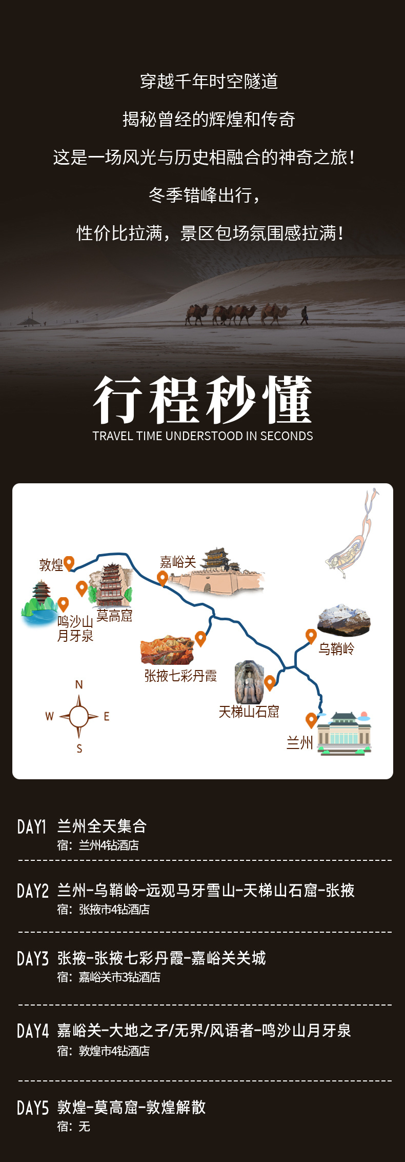 4、门票:天梯山石窟门票、张掖七彩丹霞门票+环保车、嘉峪关关城门票、鸣沙山月牙泉门票、莫高窟淡季门票