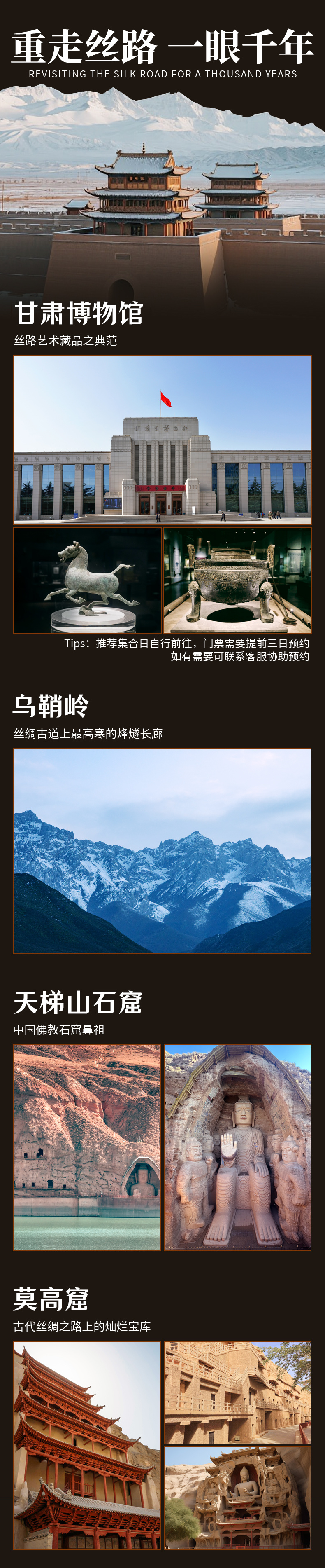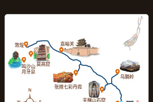 兰州-(180km,约2.5h)乌鞘岭-远观马牙雪山-(90km,约1.5h)天梯山石窟-(290km,约4h)-张掖市