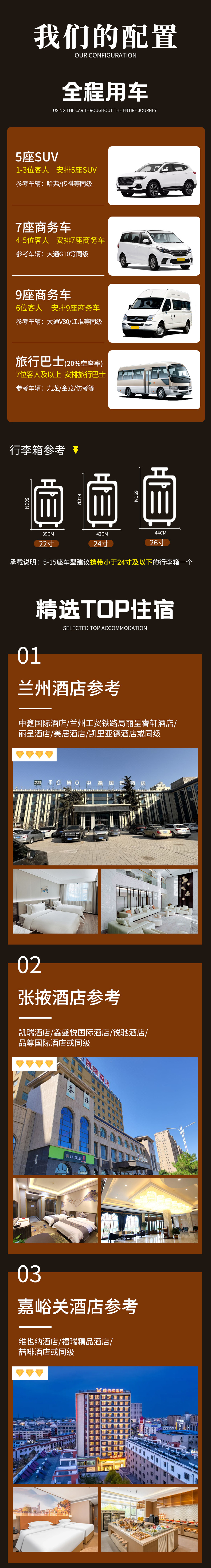 3、用车:2-3客人安排5座SUV,4-5客人安排7座商务车,6客人安排9座商务车,7客人及以上根据人数安排旅行巴士,保证百分之二十空座率(小团副驾驶及前后座位置需要轮流乘坐,望悉知)