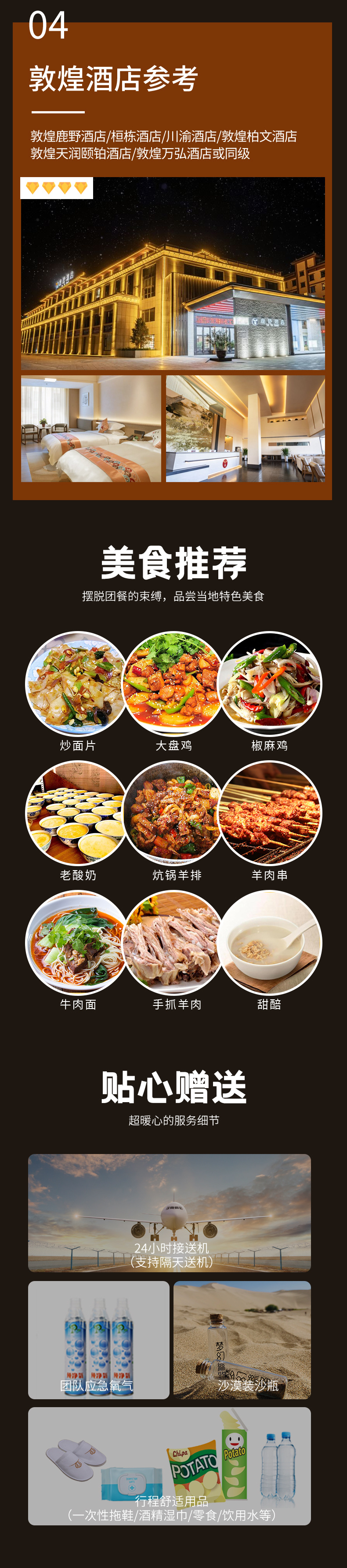 1、住宿:兰州4钻酒店标间1晚、张掖市4钻酒店标间1晚、嘉峪关市3钻酒店标间1晚、敦煌4钻酒店标间1晚