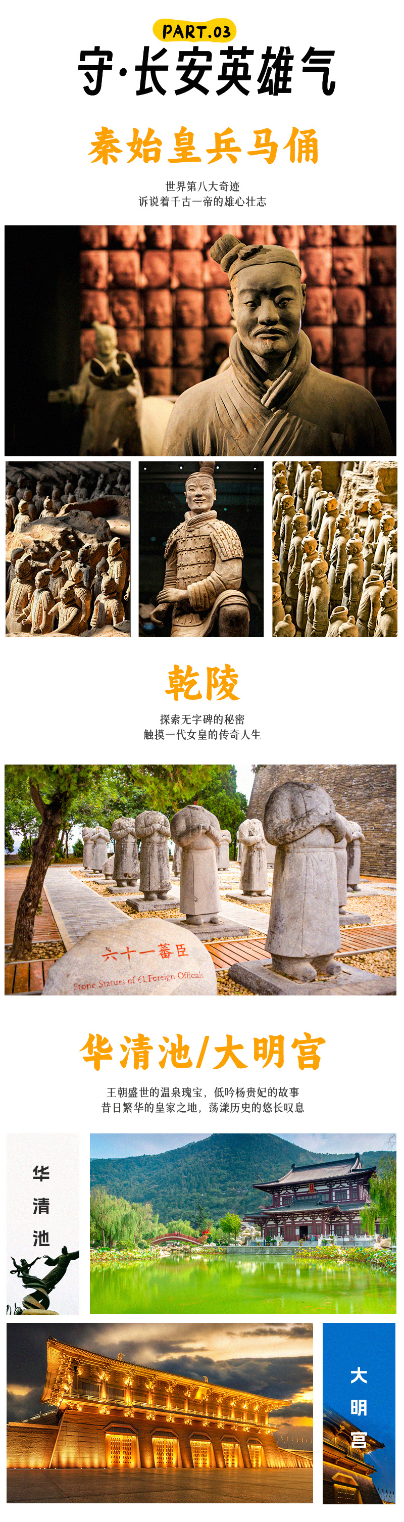 【门票】兵马俑首道大门票,华清池首道大门票或大明宫国家遗址公园大门票+定点讲解+电瓶车费用(二选一),乾陵门票及景交;(如您选择D4行程安排:另外包含城墙首道大门票,西安博物院大团讲解及耳麦费用,及汉服+妆造费用;)