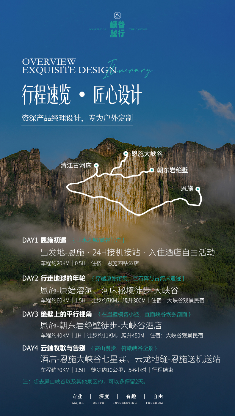 注:如果下大雨,徒步路线无法行走,则领队有权根据情况调整第2-4天行程顺序; 如考虑到安全原因,则有权调整为恩施景区,参考梭布垭石林景区。