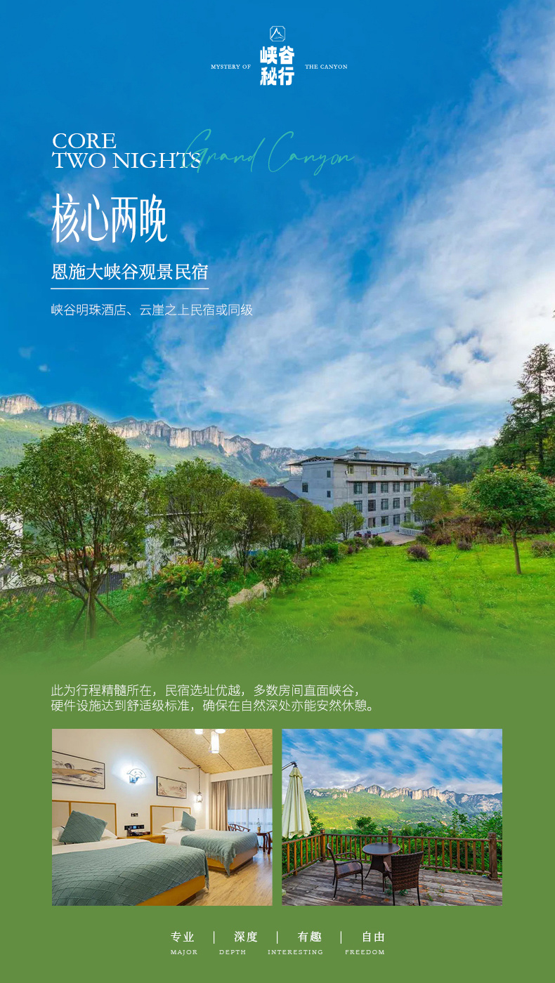 2.住宿:大峡谷三星民宿2晚(参考峡谷明珠酒店等)、恩施四星酒店1晚(参考住景国际酒店、奥山雅阁酒店、锦江都城酒店等);