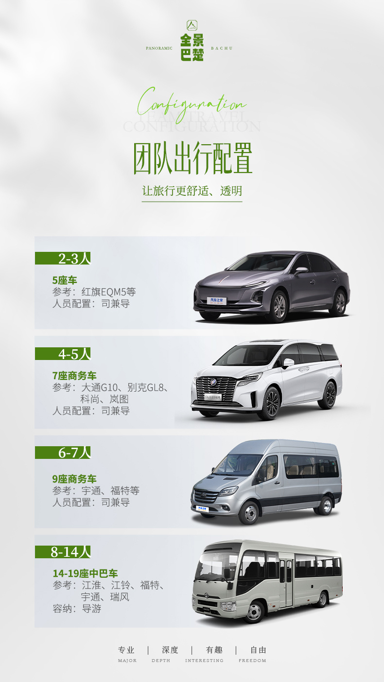 2-5人安排5-7座商务车(司机兼领队)