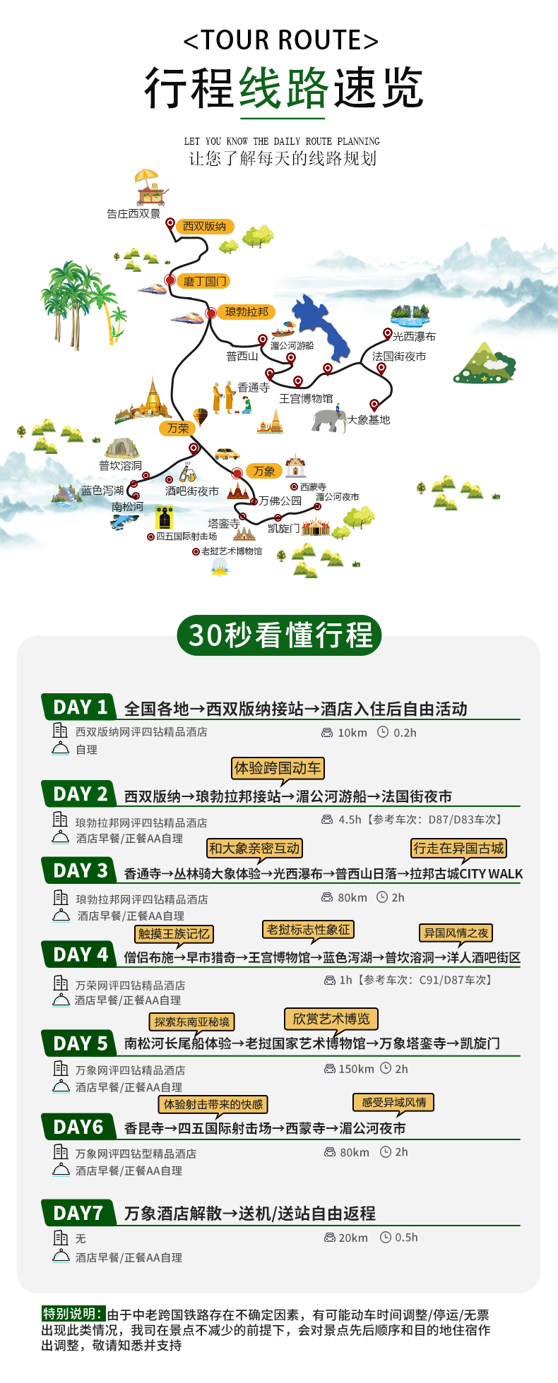 温馨提示:由于中老跨国铁路存在不确定因素,有可能动车时间调整/停运/无票,出现此类情况,我司在景点不减少的前提下,会对景点先后顺序和目的地住宿作出调整,敬请知悉并支持。