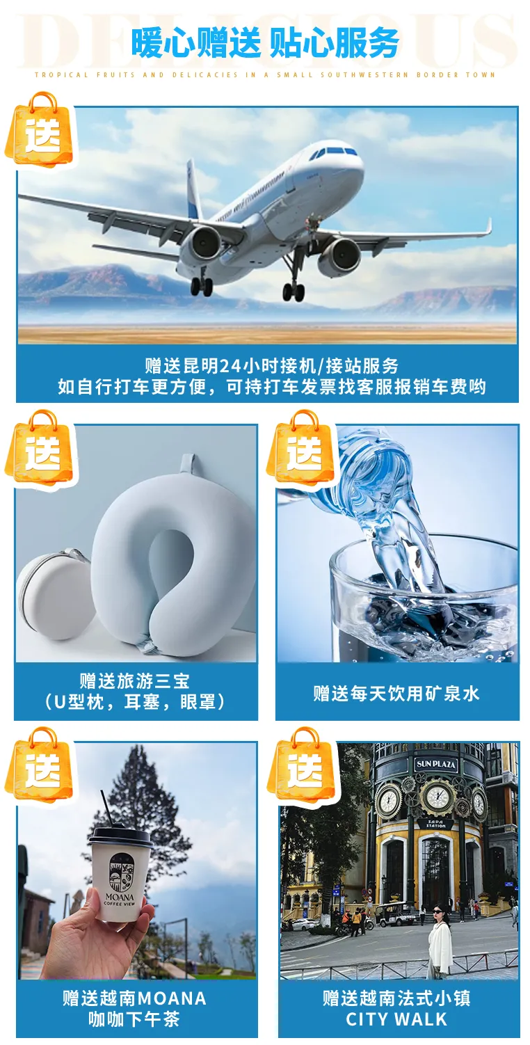 其它:行程外其它一切个人自由消费项目,如景区小交通/小火车/商业演出等,越南导游小费50元/人,敬请自理;