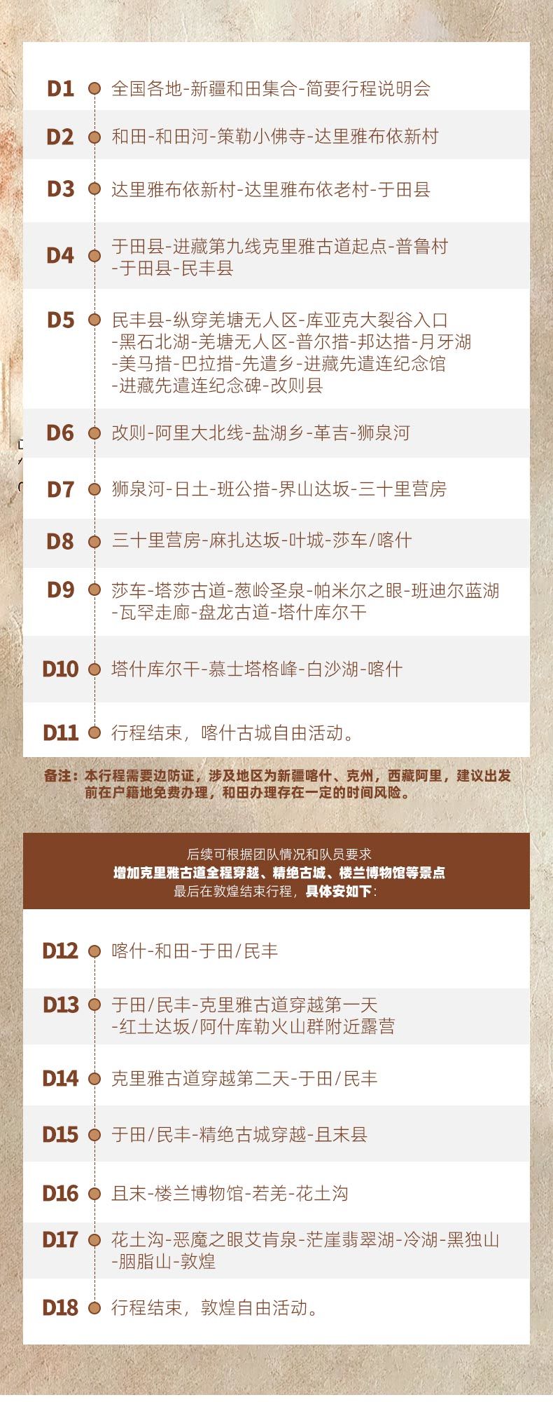 (2)如欲深度穿越克里雅古道,在季节合适、通行情况理想的情况下,全体或者部分队员同意,我们可以在行程的D5-D6天之间安排克里雅古道的全程深度穿越,穿越时间和具体费用以当时实际情况为准。