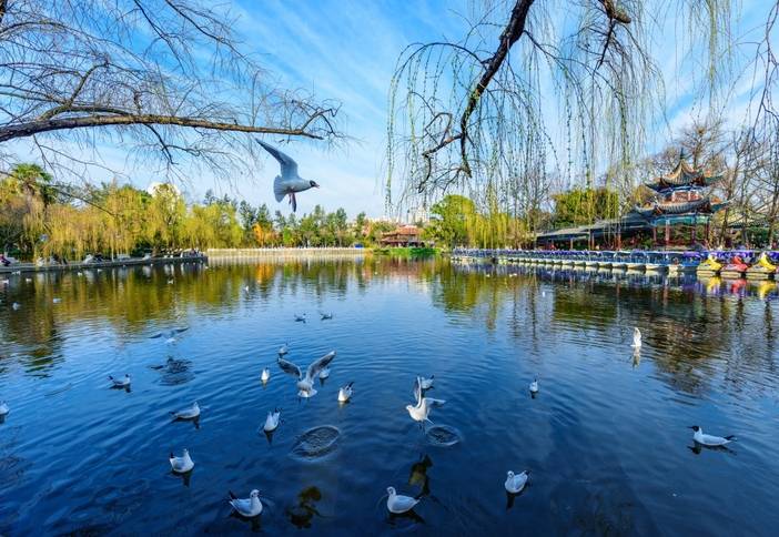 4、滇池海埂大坝,观景长廊,以开阔的湖景、壮观的红嘴鸥群和西山“睡美人”山景闻名,每年11月至次年3月,是最佳观海鸥胜地。