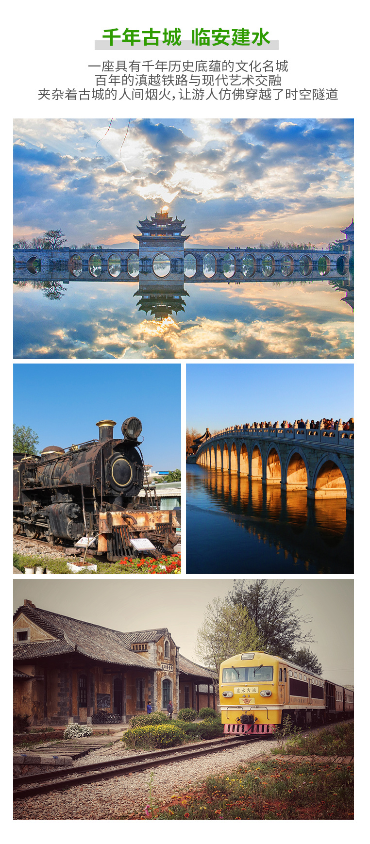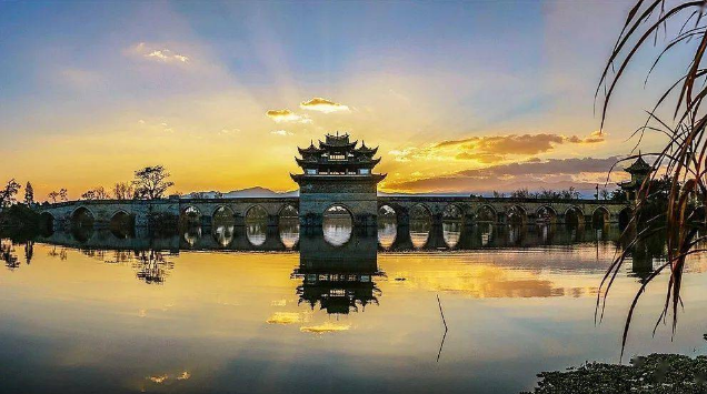 早晨起来酒店早餐后,统一前往建水临安米轨小火车主题公园。来到这里,仿佛穿越到上世纪民国初期,车站是极具法式风情的黄色建筑,复古又出片。在这里不仅是一场旅行,更是一次穿越时光的奇妙之旅。适时前往【十七孔桥】,清代古桥代表作,因横跨泸江与塌冲河交汇处得名“双龙”,日落时分十七孔桥洞与水中倒影相接,形成“长虹卧波”的绝景,被誉为“滇南大观桥”。