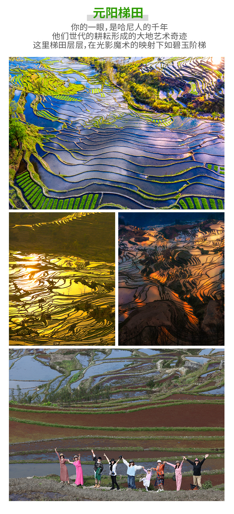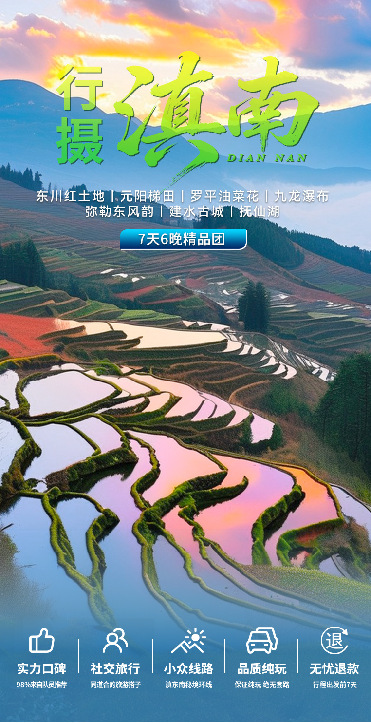 3、门票:行程内所列景点门票(东川红土地,元阳梯田,阿者科,罗平九龙瀑布群,金鸡峰丛,普者黑三生三世十里桃花,东风韵景区,建水古城,抚仙湖);