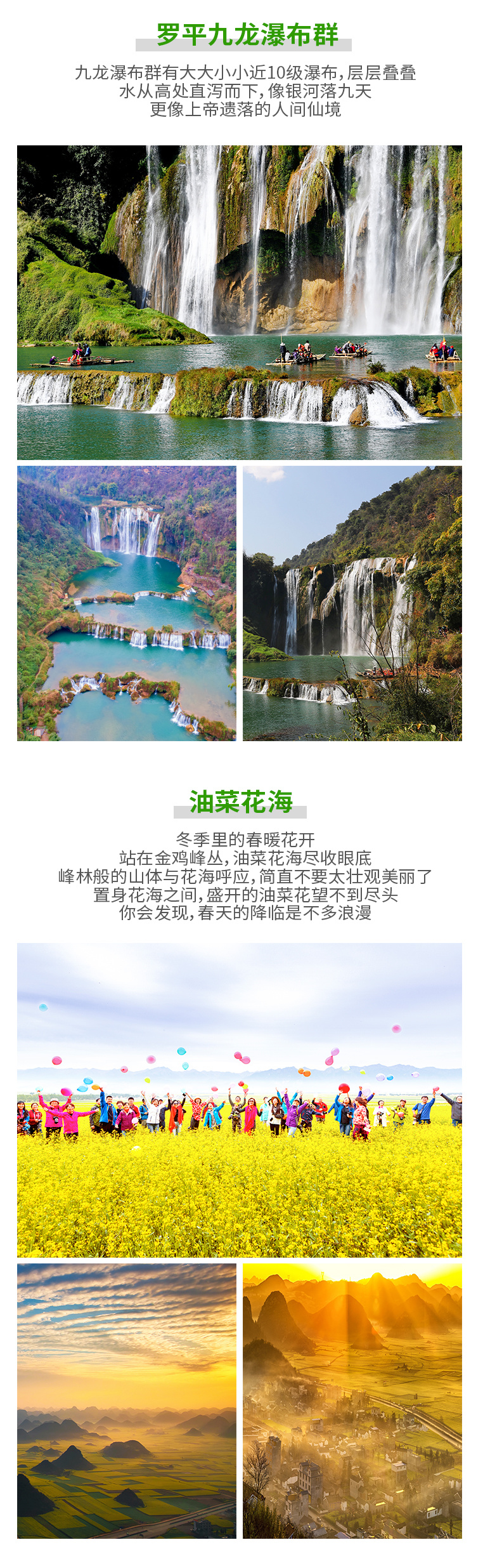 本线路为应季风景产品,当天行程发团时间为:11,12,1,3,4月,油菜花季为春节前后近一个月花期,将弥勒景区调整为罗平油菜花季行程。