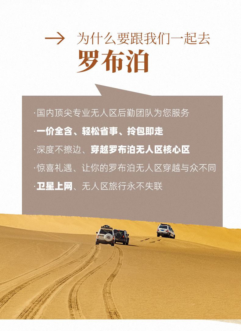 【行程概述】第一缕阳光洒在大漠中,追光者早已架起设备疯狂捕捉,日出拍摄活动结束后,厨师早已为大家准备好热腾腾的早餐。吃过早餐,开始新一天的征程,我们向“光”而行,感受薪火相传的国家力量。彭加木,中国生物化学家、革命烈士,曾多次进入罗布泊开展科研工作,为中国的植物病毒研究做出了大量的贡献。如今,他脚步最后消失的地方纪念碑已不复存在,但他的足迹仍旧停留于此。【彭加木失踪纪念地】不是一处景点,而是心灵对话之地,国与家,奉献与收获。拜别了彭加木,我们赶往【一号科考纪念碑】,这是2003年中科院科考队考察罗布泊时建立的第一个营地。我们继续前行,去探秘沙漠中最像月球的地方【阿奇克谷地】。松软的细沙、低矮的沙丘、平均风速最小、降雨量最小,是最适合实验月球车的地方。“玉兔”号月球车在月表开始漫步之前,已在这里行走一个月。如今我们还可以看到各种实验残骸,国家的力量在这里得以彰显。一起去寻宝吧,在去往【天坑】的路上沿途分布着奇石滩涂,只要你有一双发现美的眼睛,必能收获属于自己的奇石美玉,还有机会偶遇“恐龙蛋”哦,晚上我们便露营于此。