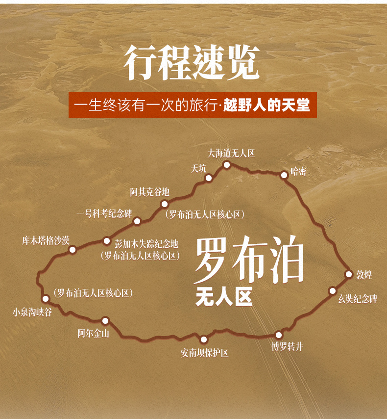 罗布泊无人区+大海道无人区+阿尔金山无人区+库木塔格沙漠+小泉沟大峡谷+博罗转井小镇+彭加木失踪纪念地+安南坝野骆驼保护区