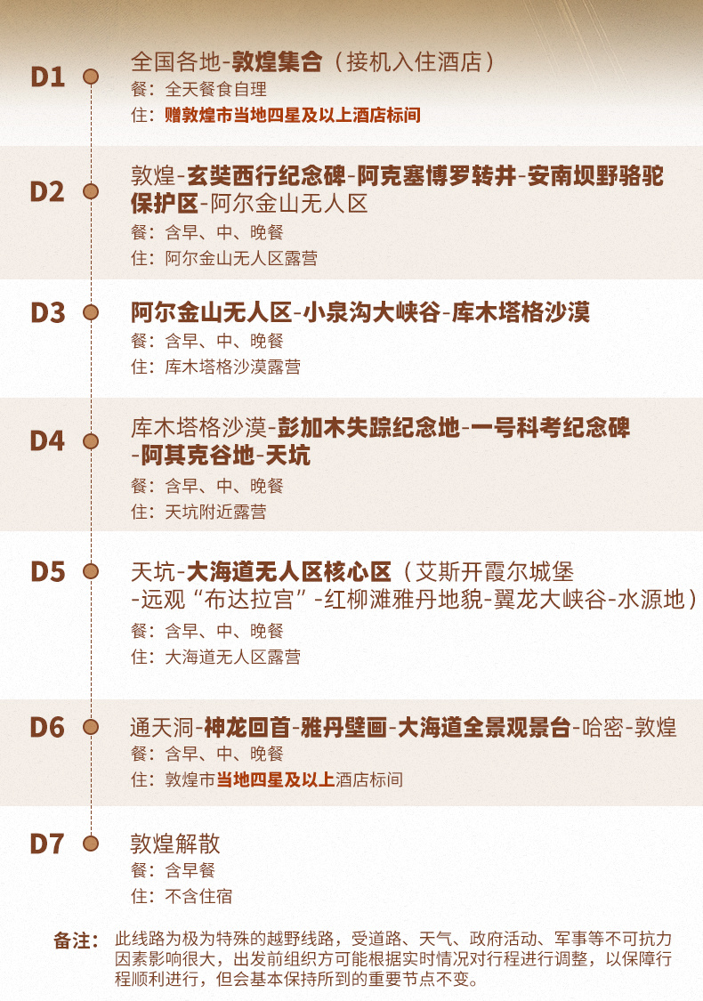 (1)此线路为极为特殊的越野线路,受道路、天气、政府活动、军事等不可抗力因素影响很大,出发前组织方可能根据实时情况对行程进行调整,以保障行程顺利进行,但会基本保持所到的重要节点不变;