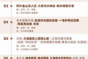 【行程概述】【大海道】是古敦煌途经哈密抵达吐鲁番的一段神秘近路,众多罕见的地理地貌在这片无人之地孕育,我们今天将带大家一一打开属于大海道的独特之处,雅丹城堡让人目不暇接,其中的艾斯开霞尔城堡更加令人赞叹,维语意为”破旧的古城",如今残高6-8米,现存清代修缮的防御设施及两处城堡,设有望孔成堡与雅丹共同构成了荒凉且神秘的景观。参观完毕后我们将路过一片恢弘的雅丹地貌,远观如同布达拉宫,让人的思绪飘忽至雪域高原。如果之前的景色令大家感叹自然的无情与生命的调零,那么接下来的景观属于生命的萌发,茫茫沙海戈壁中极其珍贵的水资源,即将向你展开属于它的画卷。红柳的坚韧是生命的坚持与守望,穿过翼龙大峡谷,水源地潺潺的水声你可否听见?