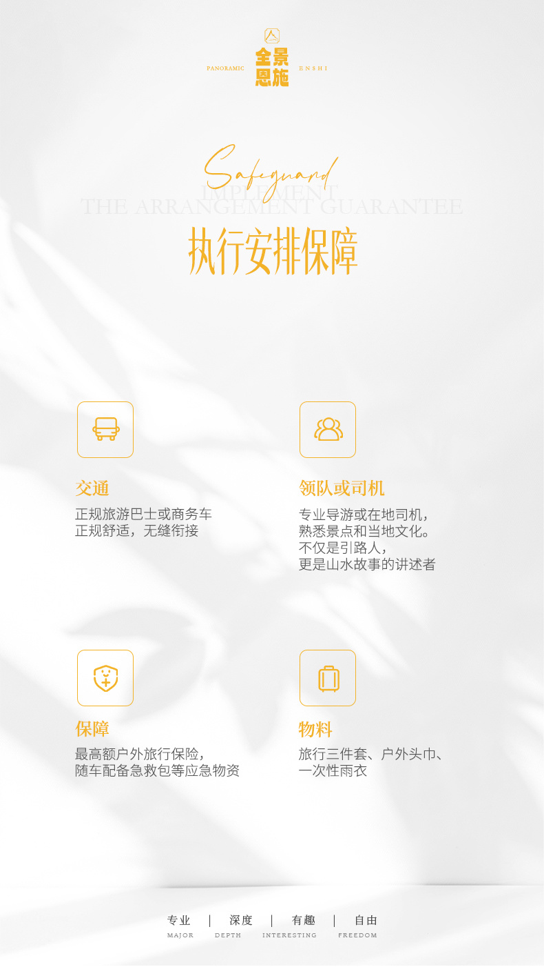 2.【酒店入住】每日12时以后,前台说明“全景恩施+姓名”办理入住,出示证件,押金自理。