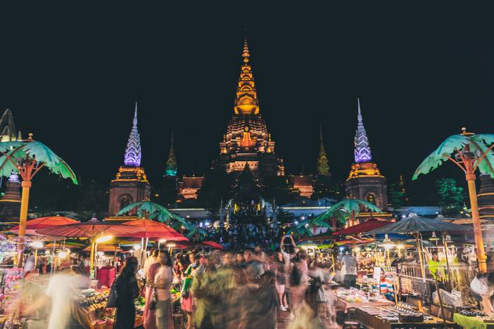 18:00 前往【告庄夜市】,六国烟火在此交汇:傣家香茅草烤鱼焦香碰撞老挝啤酒花的微苦,缅甸翡翠摊旁飘来泰式冬阴功的酸辣。大金塔俯视着人潮涌动,纸灯笼照亮少女腕间孔雀银铃。当鼓点与傣泐语情歌淹没街道,整个澜沧江流域的活色生香在此沸腾。