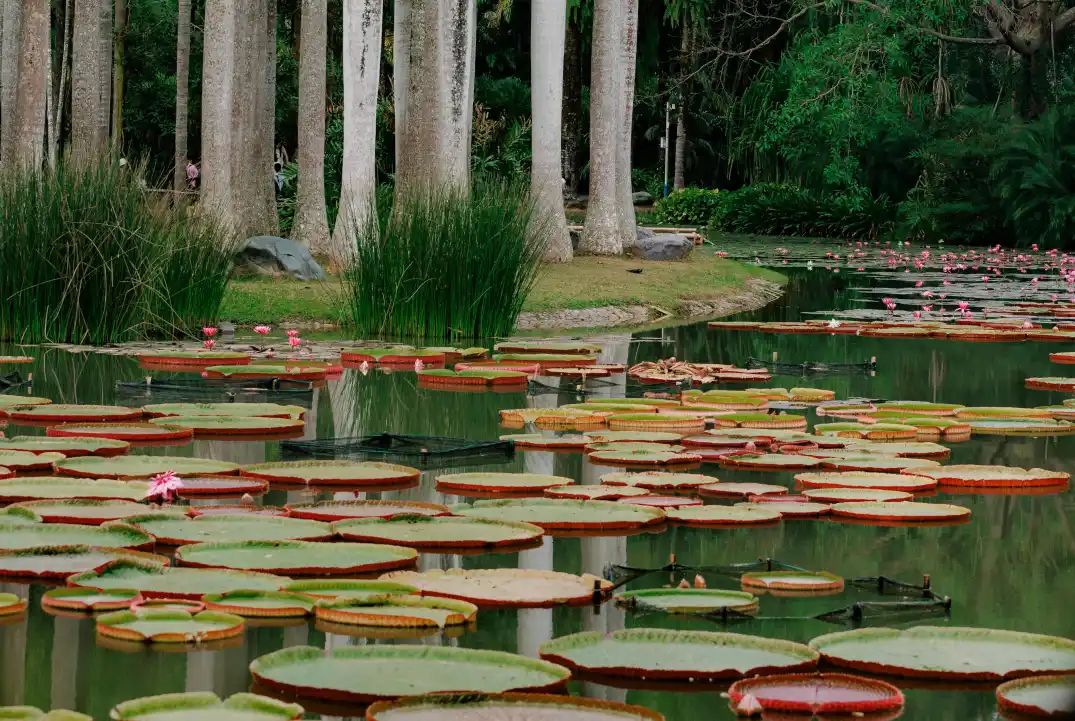 08:30 前往【中科院植物园】,王莲托起孩童的笑声,跳舞草随情歌摇曳腰肢。穿过绞杀榕构筑的绿色拱门,忽见橡胶林间飞出蓝喉拟啄木鸟。这里是北纬21°的诺亚方舟,收藏着地球最绚烂的生命密码。