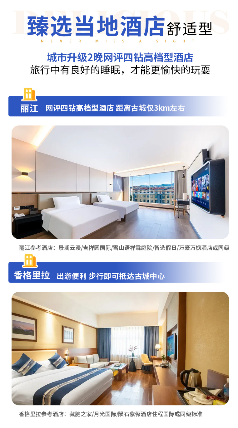 2、住宿:全程2晚网评四钻酒店+4晚核心景区优选当地酒店(丽江网评四钻酒店1晚,香格里拉网评四钻酒店1