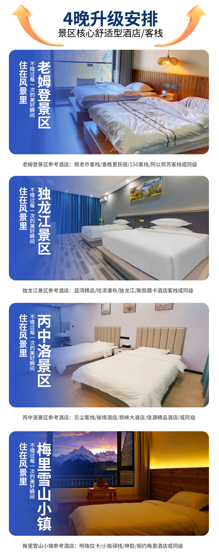 晚,老姆登景区优选舒适酒店/客栈1晚,独龙江景区优选舒适酒店/客栈1晚、丙中洛景区优选舒适酒店/客栈1