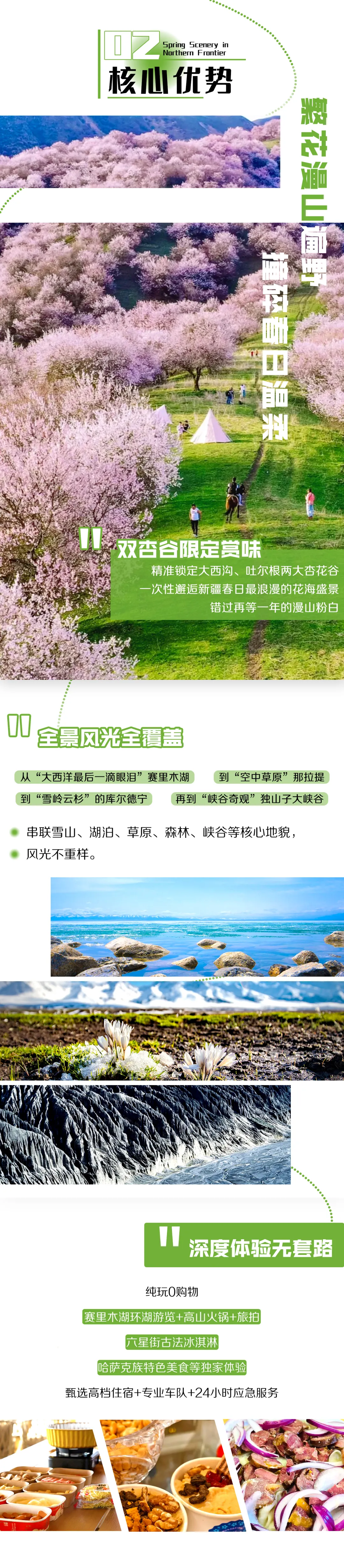 3. 全程景区门票+区间车:赛里木湖门票+区间车、大西沟杏花谷门票+区间车、吐尔根杏花沟门票+区间车、那拉提草原门票+空中草原区间车、库尔德宁门票+区间车、木特塔尔沙漠门票+区间车、独山子大峡谷门票。
