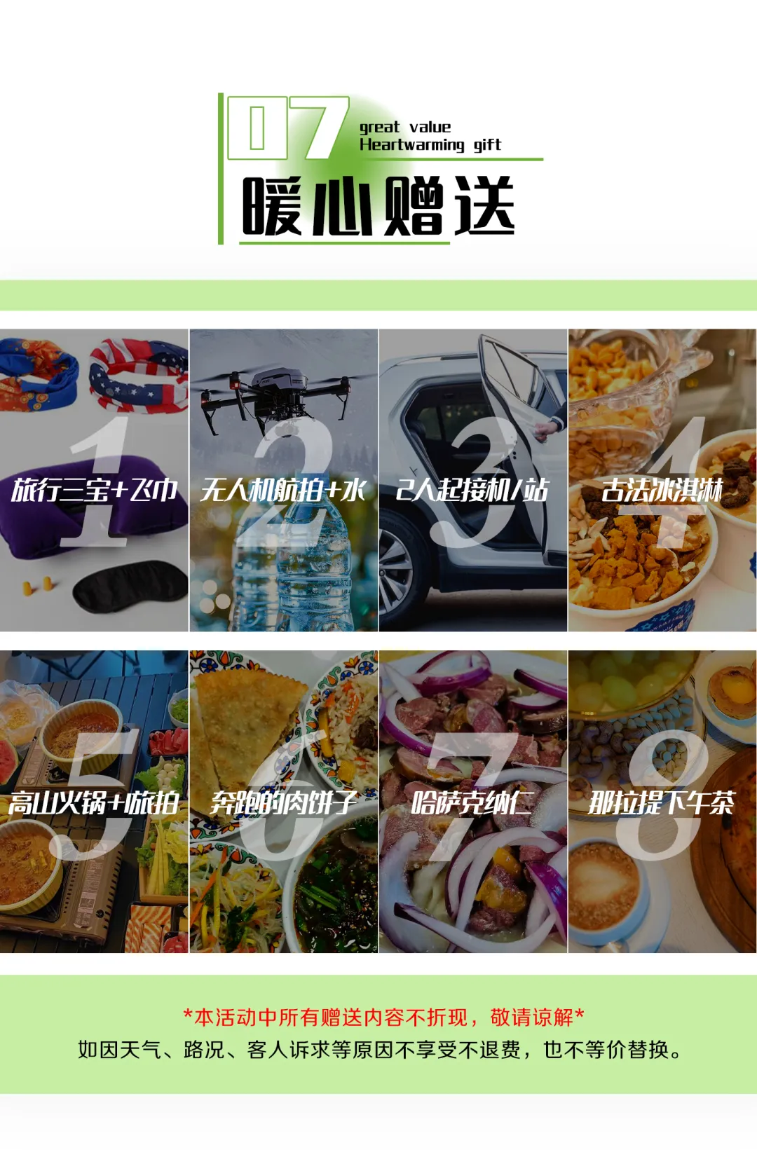 3. 赠送集合日当天免费接机/接站服务(2人起赠送,提前抵达者请自行前往酒店)。请提前至少3天告知航班/车次信息,如未告知,视为自动放弃。默认安排拼车(1小时内),如您不想等待,可自行打车或搭乘地铁前往酒店(费用自理)。抵达乌鲁木齐机场/火车站后,请主动联系接机人员确认上车位置,如出现等候的情况,请给予谅解。不含送机及送站服务,送机(站)服务:5座车100元/辆、7座车200元/辆,如需要请提前至少1天告知工作人员。