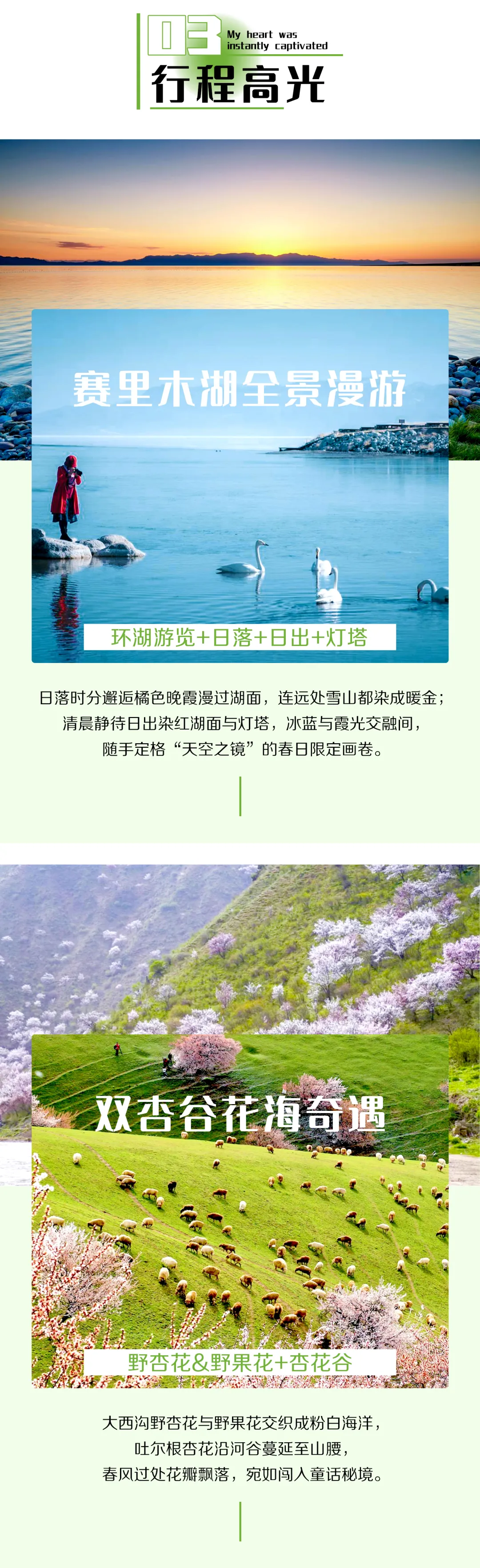 赛里木湖(环湖游览、日出、灯塔、旅拍)—果子沟大桥—大西沟杏花谷/惠远古城—六星街古法冰淇淋—伊宁