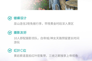 我们将乘车前往巫山神女天路,一路乘坐景交车穿越巫峡,欣赏“曾经沧海难为水,除却巫山不是云”的壮观景象,一路红叶相伴,美不胜收,这里也被驴友评为长江上最美的三峡画廊。