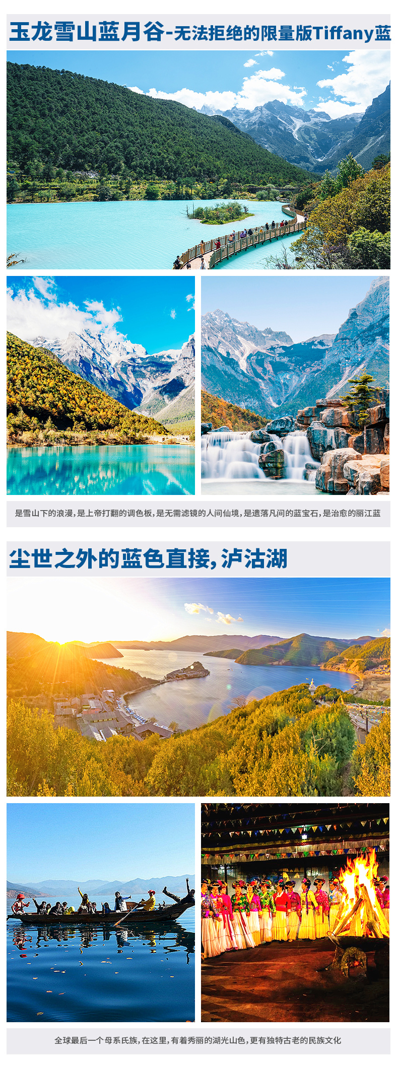 3、门票:行程内所列景点门票(玉龙雪山景区+蓝月谷套票、云杉坪索道+索道环保车、虎跳峡门票、普达措国家公园+景区环保车、泸沽湖门票);