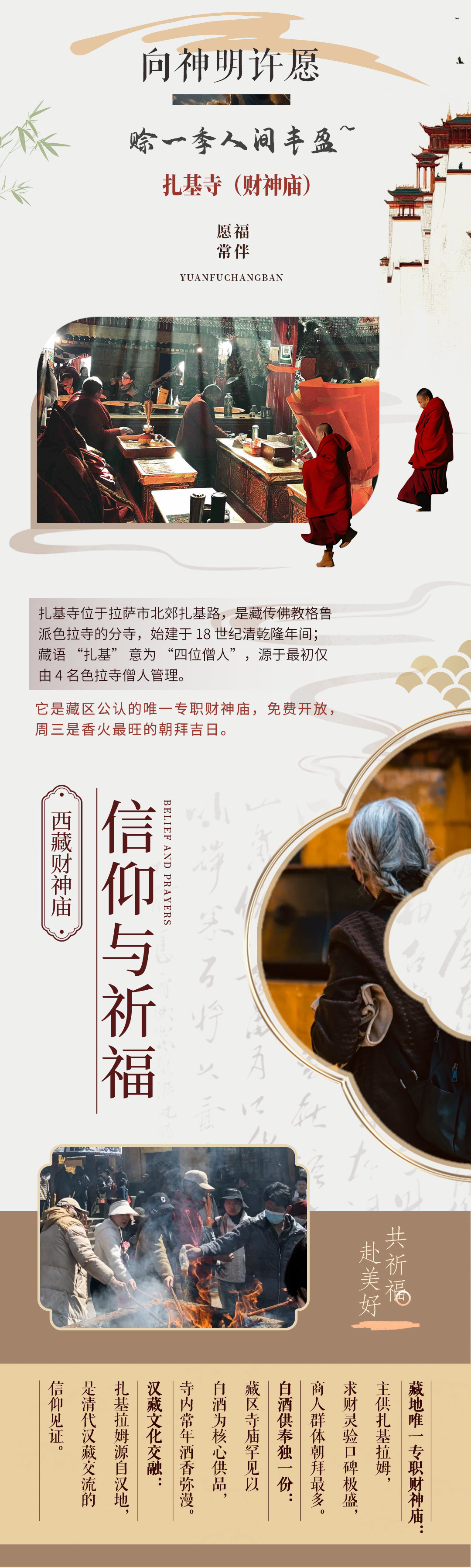 早晨乘车从拉萨出发,早上从酒店出发,前往扎基寺,扎基寺的“财神爷”在藏语里被称作“扎基拉姆”。据说,这是拉萨城的护法神“吉祥天母”的世间化身,本在汉地,后随一位赴汉地的色拉寺大师来到拉萨(也有说是随文成公主进藏的),后被供奉在扎基寺。扎基寺的财神菩萨是西藏最灵验的,但凡求财的人都来这里供奉“扎基拉姆”。因此,扎基寺便被认作是西藏唯一的财神庙。
