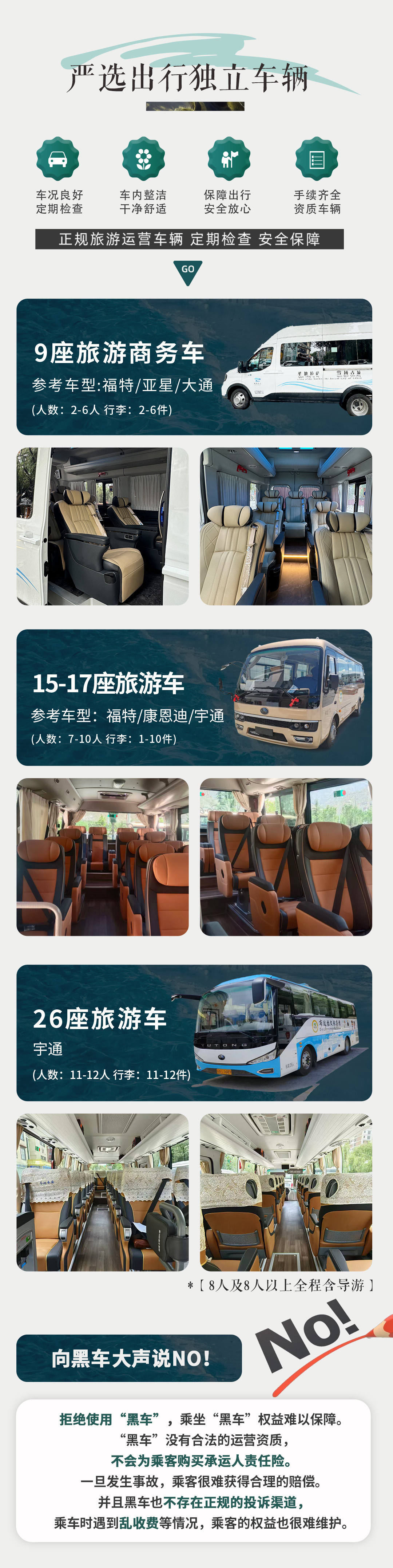 1.【交通】全程正规手续旅行用车的包车费用,同时包含每个座位的保险,全程路桥费,油费,司机食宿补贴。
