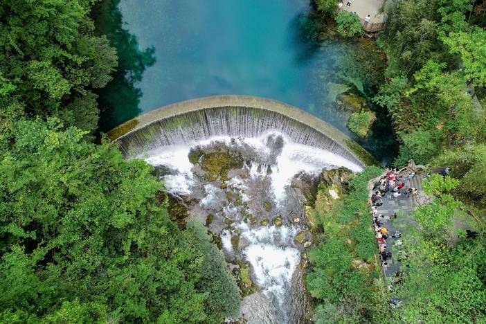进入景区, 沿栈道漫步,看拉雅瀑布飞泻而下,在古桥系上祈福带许下冬日愿望;在卧龙潭打卡“网红蓝绿色湖水”;经过鸳鸯湖,看船上悬挂的小红灯笼与湛蓝湖水相映;